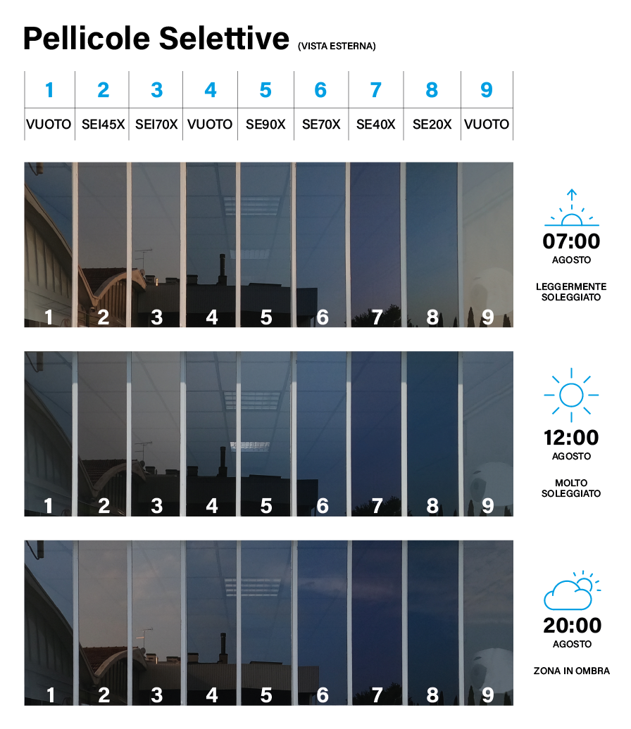 2. Pellicole Selettive scure: Pur essendo pellicole prive di metallo o solamente con ossidi di metallo risultano ugualmente visibili se paragonate al vetro trasparente. La versione più visibile è la n°8 non tanto per la riflessione, da angolazioni diverse, bensì per la gradazione scura che trasforma il vetro in fumè. Successivamente con gradazioni meno oscurate abbiamo la pellicola 2 e 7. Meno visibili ancora la n° 3 e 6 pellicole quasi trasparenti che di cui consigliamo l’utilizzo anche in vetrine espositive. Risulta minimamente visibile la pellicola n° 5.