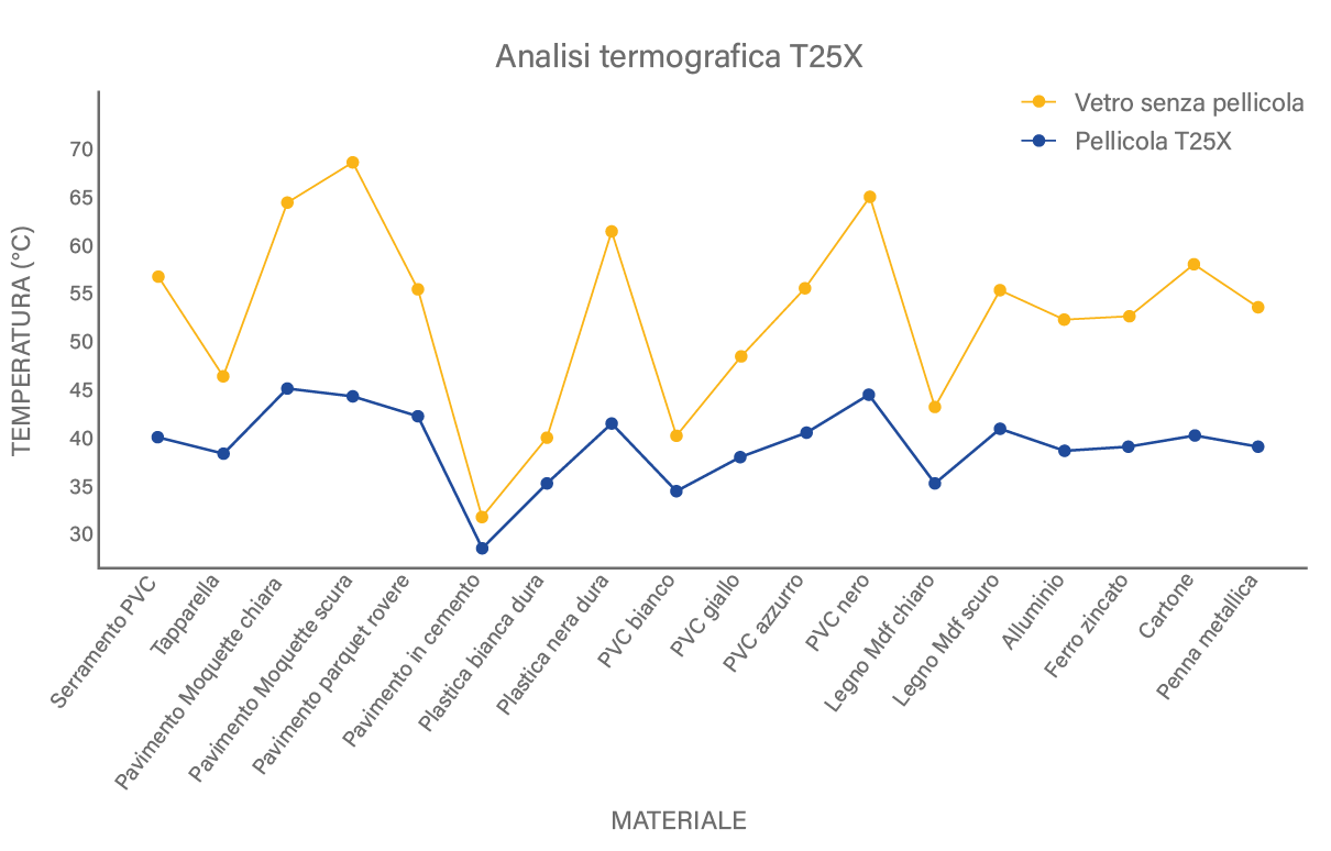 | VETRO + PELLICOLA La percentuale infrarossa che oltrepassa il vetro è più debole e gli oggetti colpiti si surriscalderanno meno. (Vedi grafico linea azzurra)| | | | |