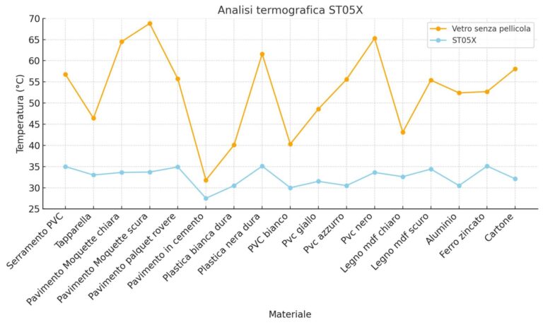Nel grafico sottostante (vedi analisi precedente), si osserva una chiara riduzione delle temperature superficiali su ogni materiale.