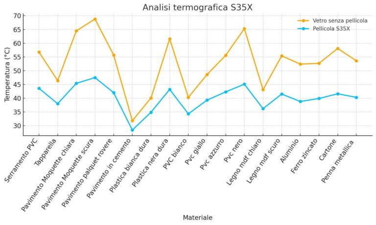 In media, la pellicola S35X riduce la temperatura dei materiali interni del 20–30%, con punte di oltre 21°C in meno su superfici come moquette e serramenti in PVC.