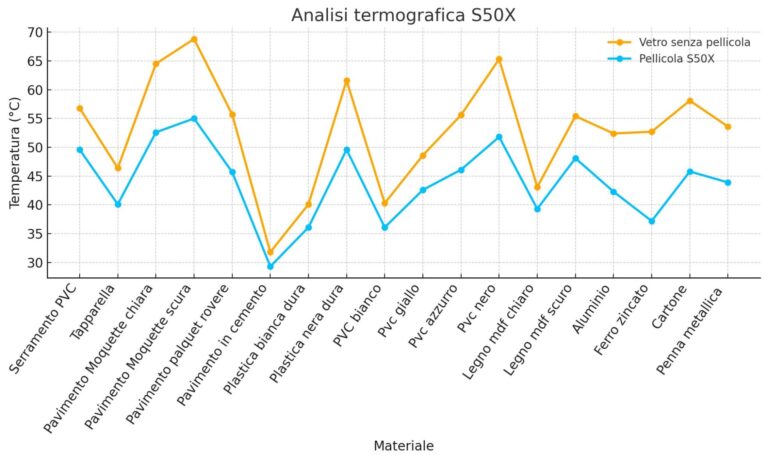 Le analisi termografiche mostrano come l’applicazione della pellicola S50X riduca le temperature superficiali dei materiali fino a 13°C rispetto al vetro non trattato, con una riduzione termica media del 20%. Questi risultati confermano la sua efficacia nel contenimento del calore e nel miglioramento del comfort abitativo.