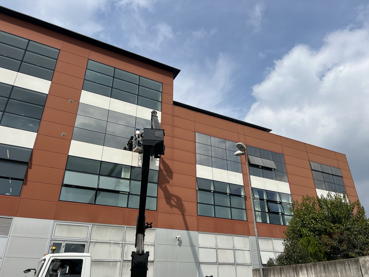 Per risolvere il problema, DOCUTEC si è rivolta noi e dopo un’analisi delle superfici vetrate e dell’esposizione dell’edificio, abbiamo proposto una soluzione basata sull’applicazione di pellicole a controllo solare T20X Max con effetto titanio, garantite 10 anni in esterno.