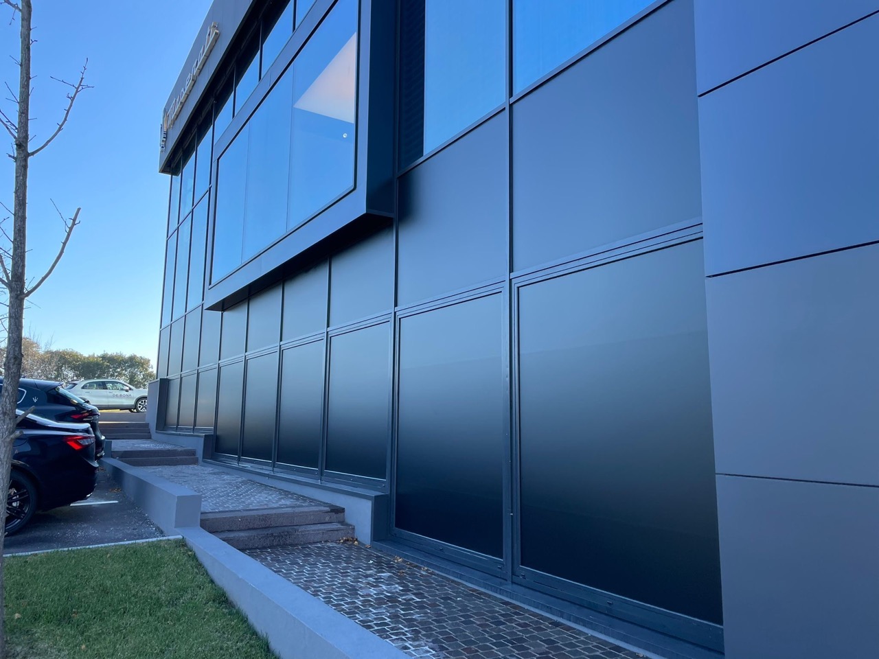 Gestire 22 marchi significa adeguarsi a standard estetici molto precisi. Colori, finiture e materiali devono rispecchiare fedelmente le indicazioni ufficiali dei brand, che nel settore automotive sono particolarmente rigorose. Intervenire sulle strutture esistenti senza interrompere l’attività delle concessionarie era una necessità primaria. Smontaggi complessi o verniciature tradizionali avrebbero comportato tempi lunghi, disagi operativi e interventi definitivi difficilmente reversibili. Inoltre, le linee guida dei marchi possono evolvere nel tempo, rendendo necessario trovare una soluzione flessibile, capace di adattarsi a eventuali cambiamenti futuri senza compromettere le superfici originali.