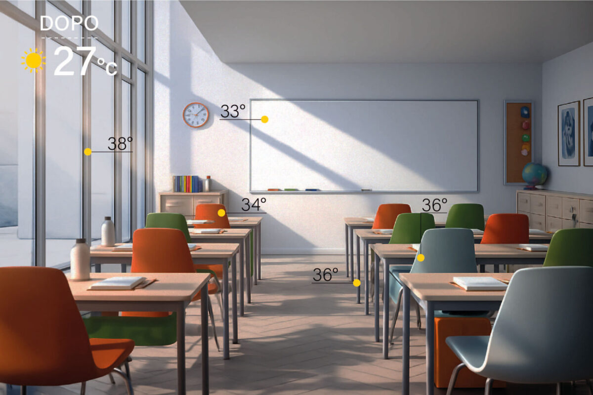 La conseguenza è un ambiente poco omogeneo, con zone molto calde vicino alle finestre e aree più fresche al centro dell’aula. In alcuni casi, le superfici direttamente esposte al sole diventano difficilmente utilizzabili.